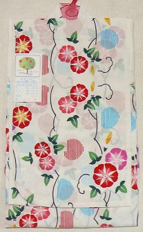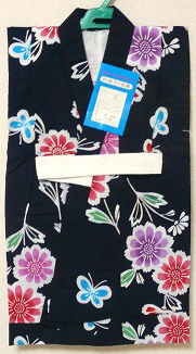 ![]() 生地と染め方で、いろいろな種類のゆかたがあります。 上記の注染のゆかたは、「平織り」の生地です。 「平織り」とは、縦糸と横糸を均等に織り込んだ生地です。 縦横が均等なので、緊密ですきまや凹凸のないフラットな布地になります。 縦糸と横糸の本数や組み方を変えることで、布地にはすきまや織り模様が できます。着物では、「絽」や「紗」といった織り方のものがあります。 子供ゆかたでよく使われているのが、「紅梅織り」の生地です。 縦横に格子状に細かく織り模様がついていて、その中が薄手で風通しが よい生地です。 上の紺色のゆかたは、「紅梅織り」の生地のゆかたです。 生地だけで言うと、「紅梅織り」の方が「平織り」よりも高価な生地です。 次に、染めですが、大きく分けると「手染め」と「プリント」の違いです。 「手染め」にも、上で紹介した「注染」以外にいろいろありますが、 子供ゆかたの場合は、ほとんど「手染め」といったら「注染」となります。 「プリント」は機械で表面に染料を乗せるだけなので、 生地の裏を見ると、白くなっています。 「プリント」生地でも、レベルの高い加工をしていると、裏まで色が 入っていますが、生地の裏が白っぽくなっていたら、手染めでは ありませんので、店舗でご購入の時は、購入前に確認して下さい。