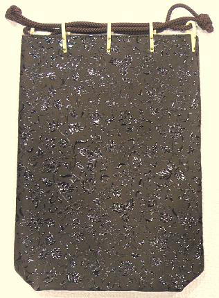 別色・柄の印伝の巾着です。 印伝にはいろいろな色や柄がありますので、 もう一つ同じ印伝の巾着をご紹介します。 一つ上のものは、紺地に菱型の組小紋柄ですが、 上の写真は、こげ茶色に蔦草の柄になっています。 どう見てもこげ茶だと思うのですが、印伝ではこの色は 「紫」と呼んでいます。 植物柄なので、女性の方がお使いになっても粋で素敵 だと思います。
